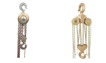 下圖中是兩個不同噸位的防爆手拉葫蘆,左邊是小噸位,右邊是大噸位。從外觀上來看,明顯能看出大噸位比小噸位多了一個罩殼,小噸位設備的罩殼只有一個,在上吊鉤的正下方,而大噸位設備的罩殼有兩個,分別位于上吊鉤的兩側。有人不禁發出疑問,大噸位的手拉葫蘆為什么會有兩個罩殼呢?接下來就給大家解決這個疑問。